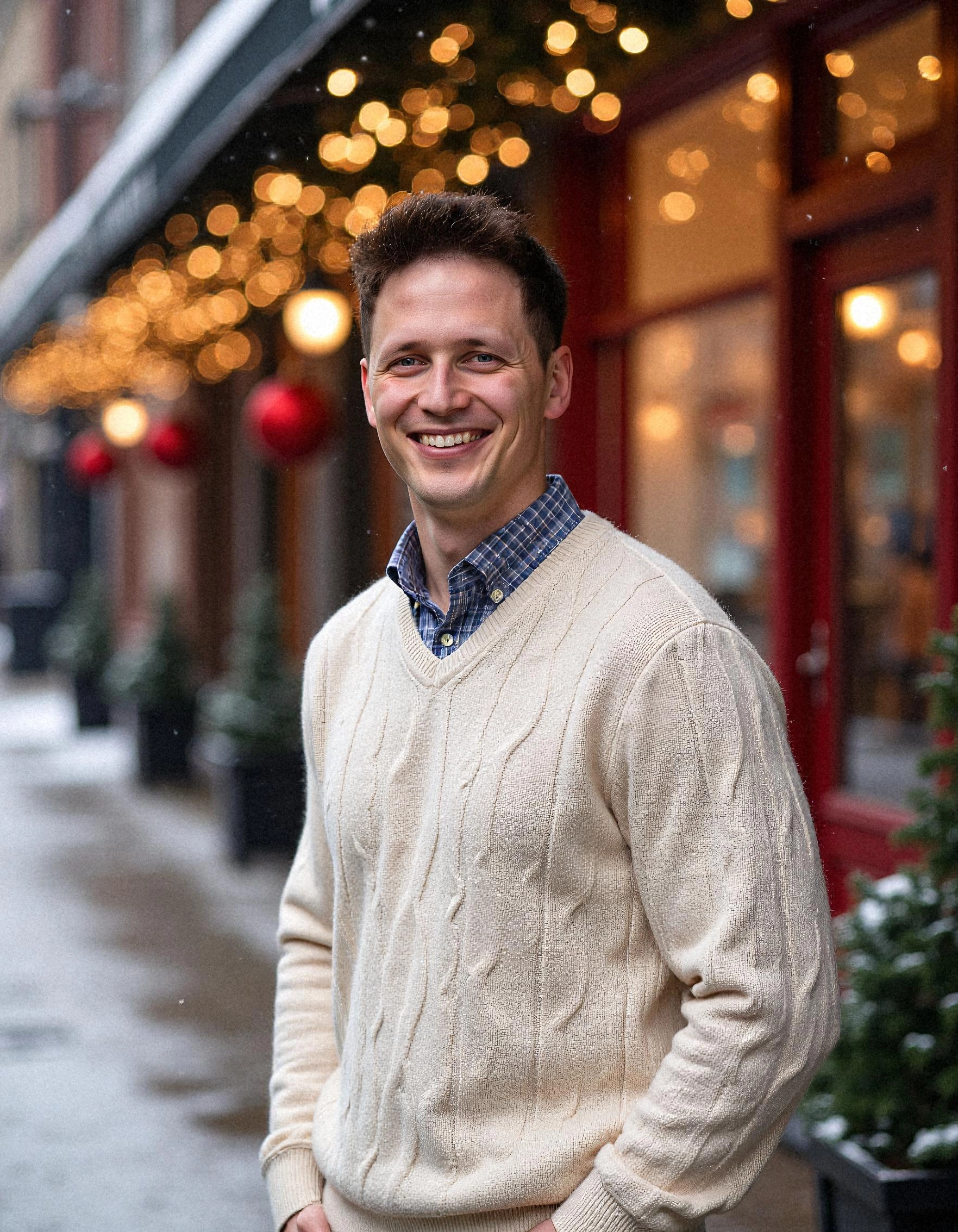 From cozy winter streets with twinkling lights to elegant indoor scenes with decorated Christmas trees and seasonal décor, each portrait captures the spirit of the season with professional polish.