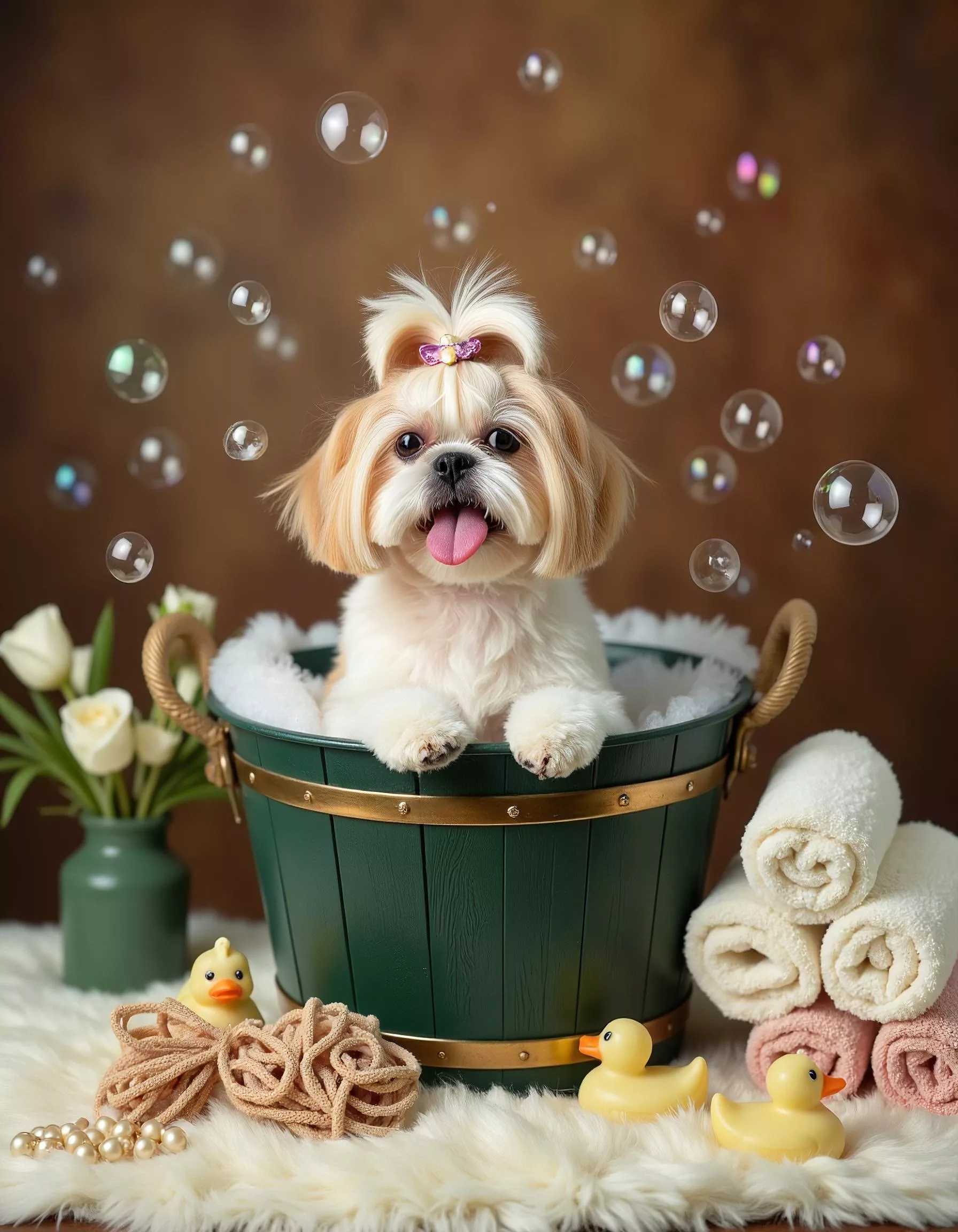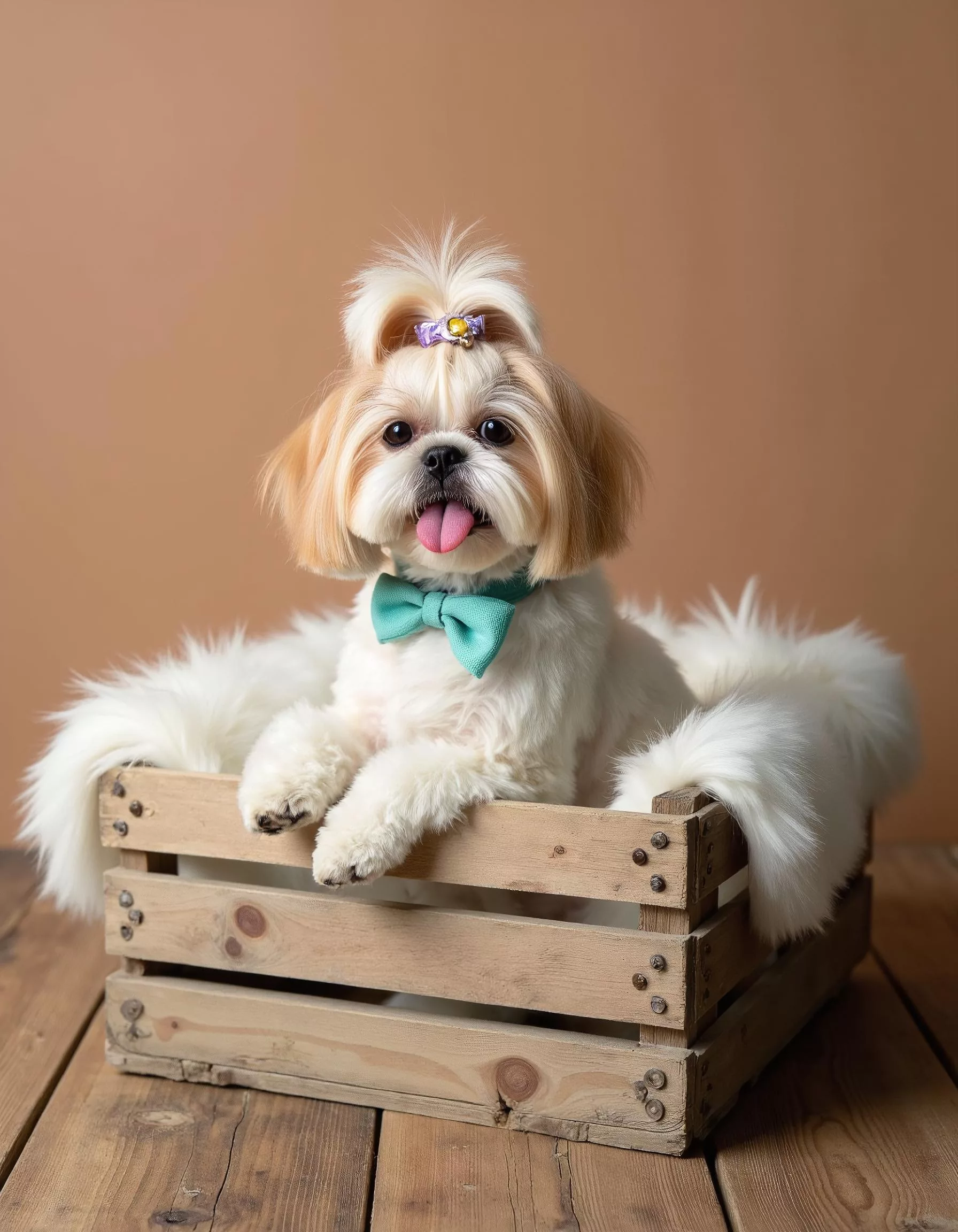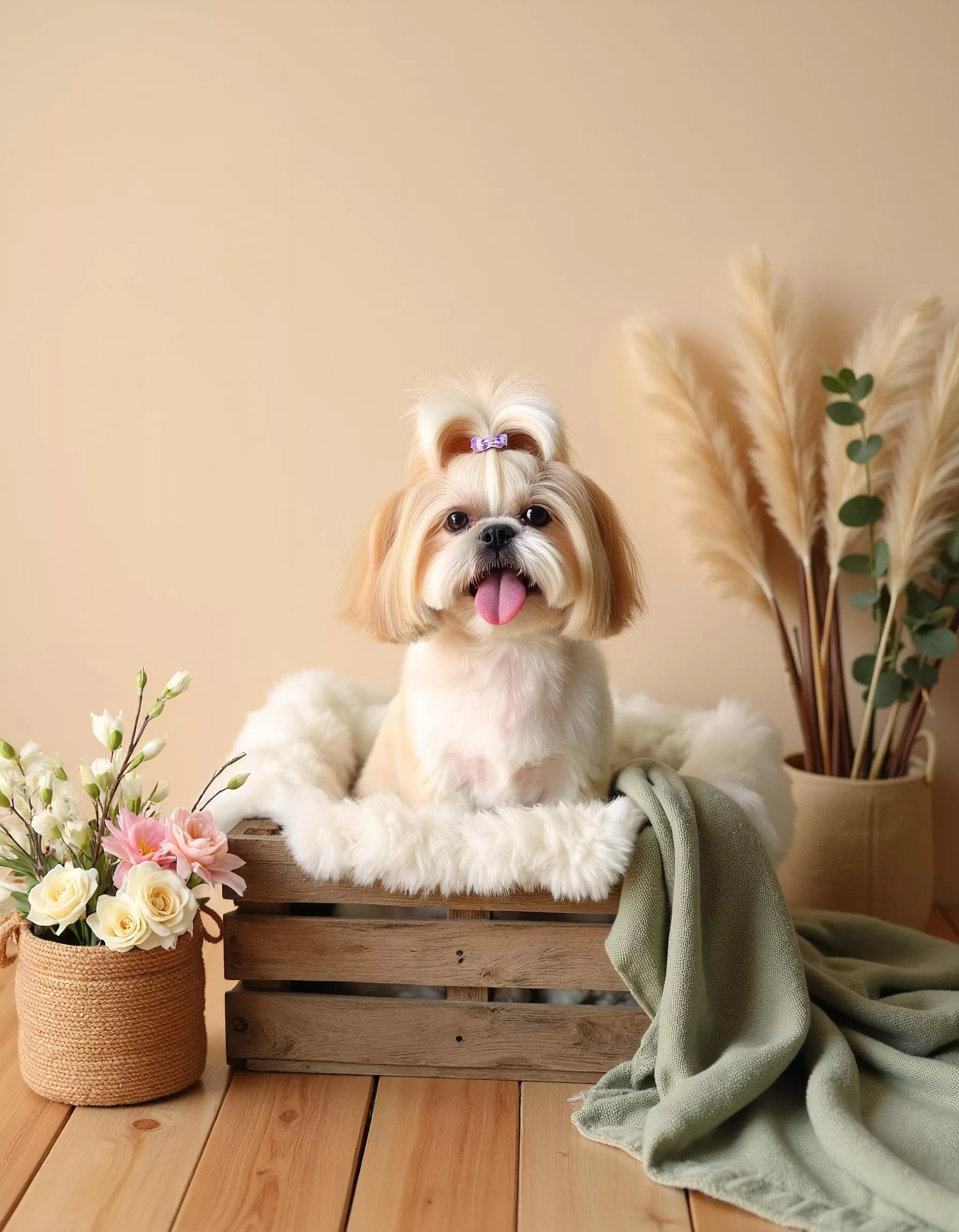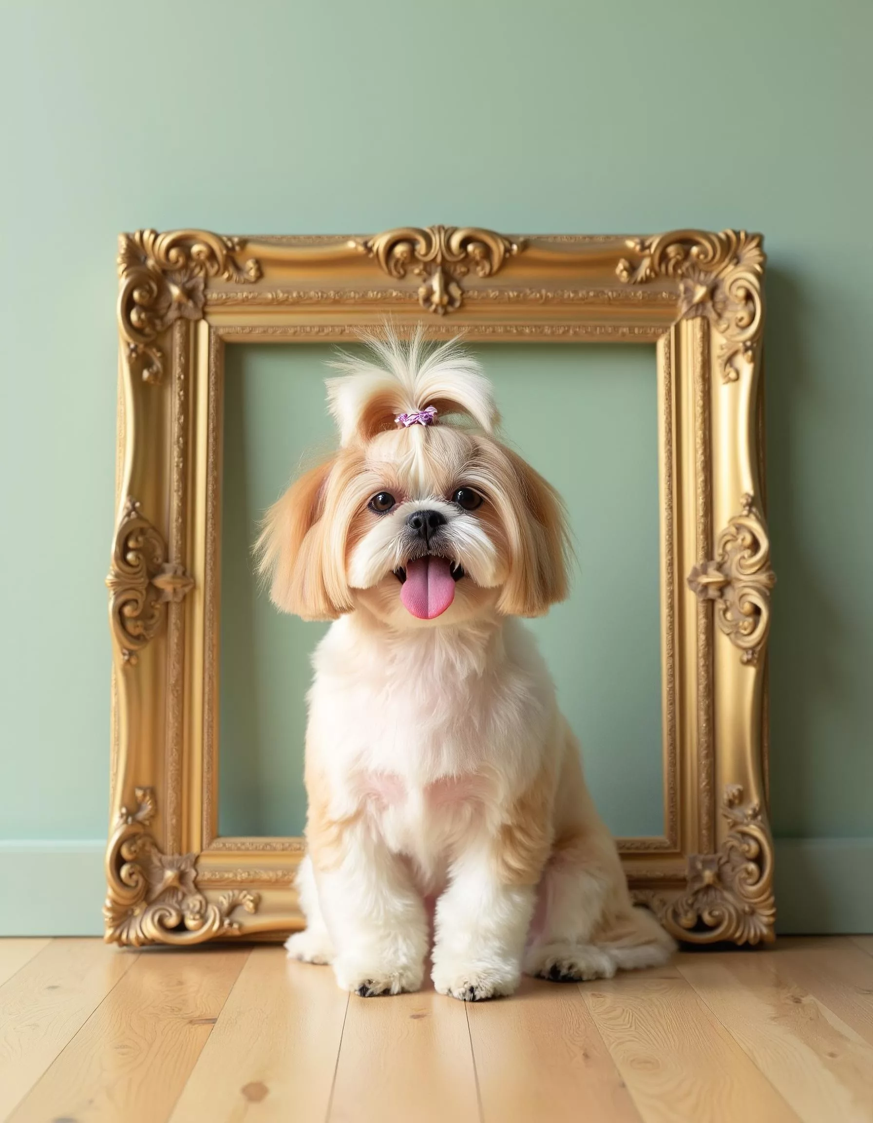 Our advanced AI engine enhances fur texture, lighting, depth, and color balance while preserving your pet’s natural expression and personality. From spa-inspired bubble bath concepts and soft pastel backgrounds to classic wooden crates, vintage furniture, and refined studio frames, each portrait is created in high resolution with professional detail.
