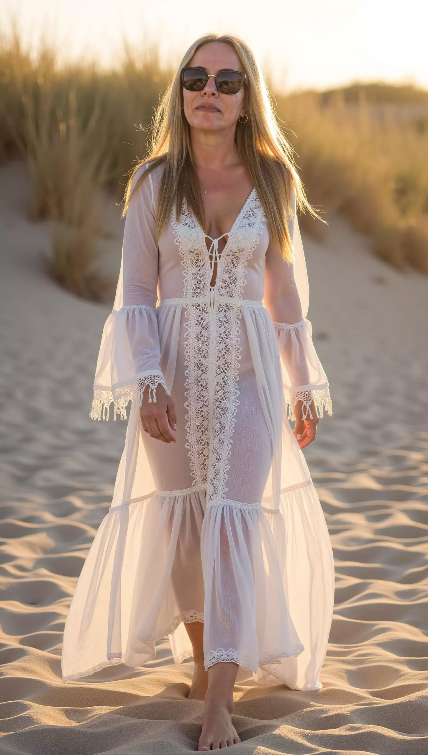 From walking along the shoreline in breezy white gowns to relaxed bohemian styles in sandy dunes, each portrait is enhanced with radiant sunset tones, natural skin detail, and flattering light that creates a dreamy, romantic atmosphere. The result is high-resolution digital portraits that feel timeless, feminine, and sophisticated.