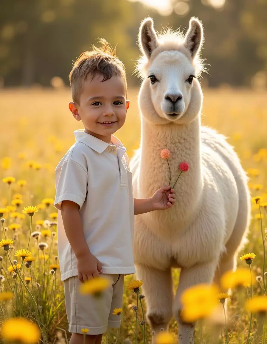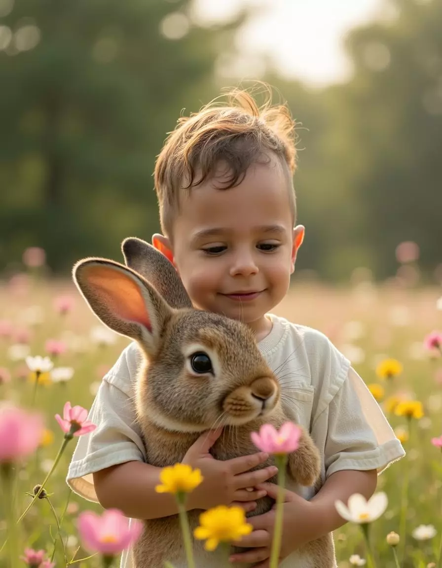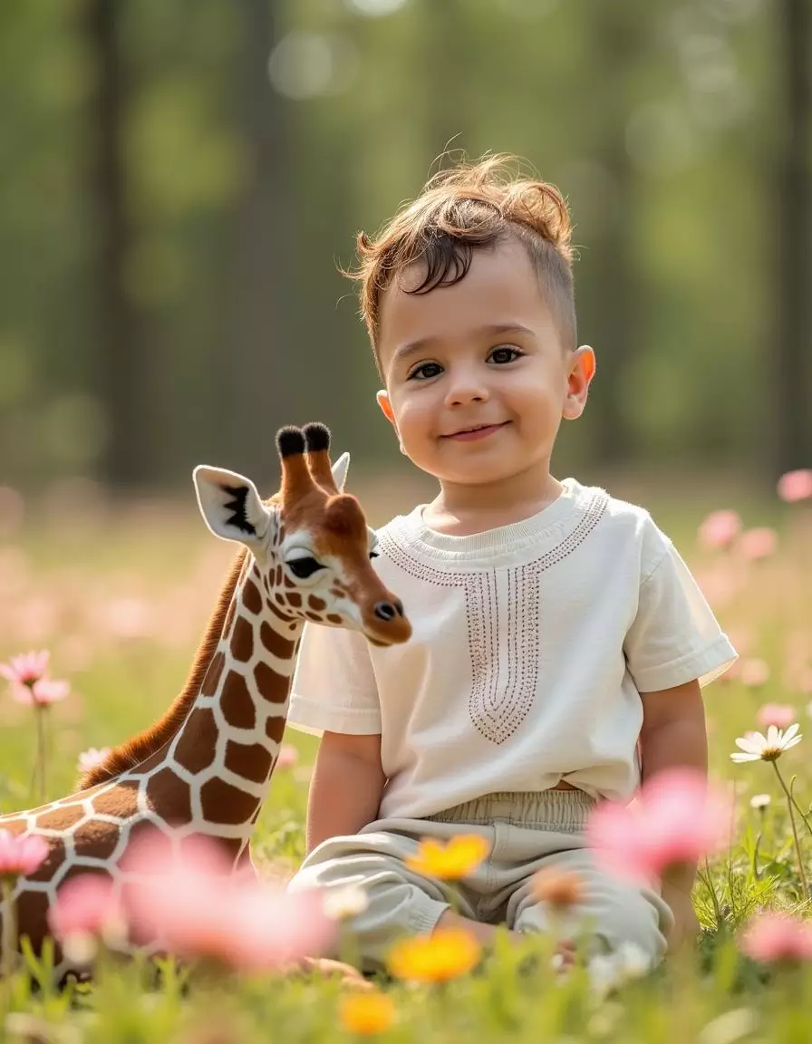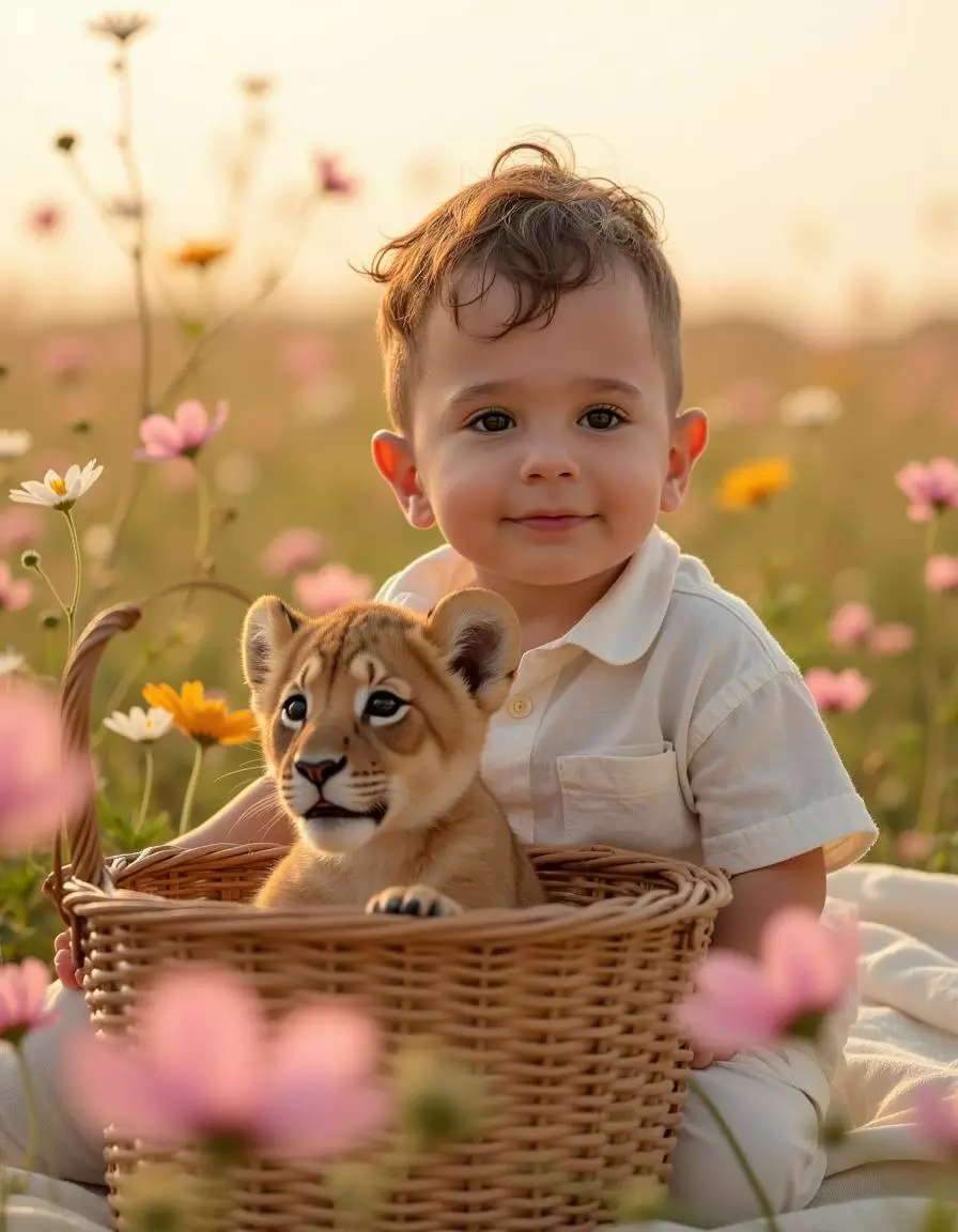Our platform specializes in AI-generated pictures that transform your uploaded photos into heartwarming scenes set in sunlit flower fields with charming animal companions and soft natural light. By analyzing your child’s features, our advanced AI engine produces realistic, high-resolution portraits that maintain authentic expressions while enhancing warmth, color, and dreamy atmosphere.